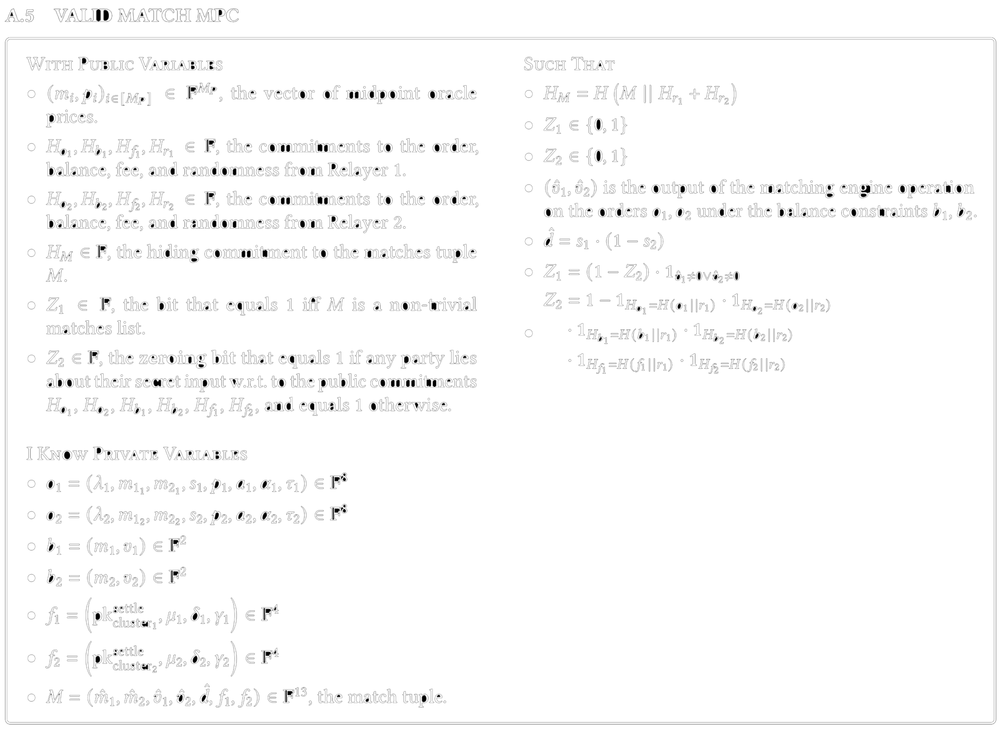 To solve this atomic settlement problem, we use the collaborative SNARK framework from Ozdemir and Boneh. By wrapping zero-knowledge proof generation inside of a MPC algorithm, collaborative SNARKs allow for the relayers to collaboratively prove a particular NP statement, VALID MATCH MPC. This statement essentially claims that given the publicly-known commitments to order information and a public commitment to a matches tuple, both traders do indeed know valid input orders.